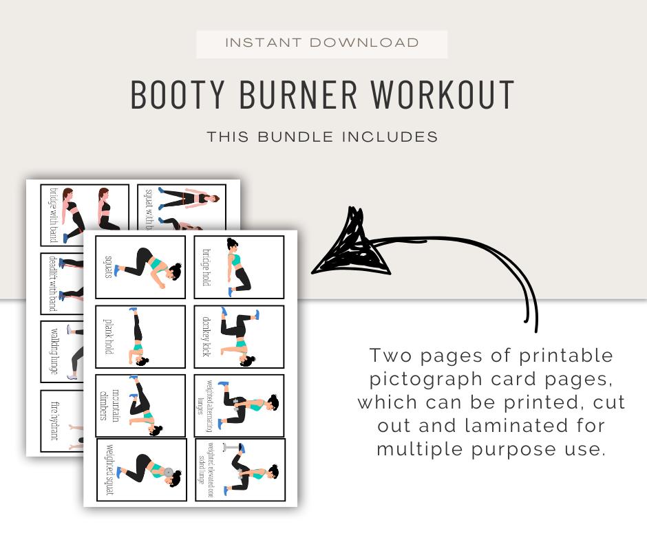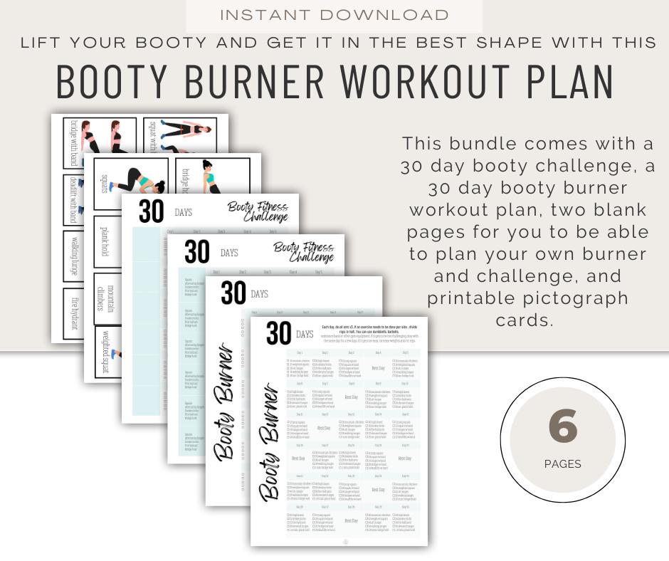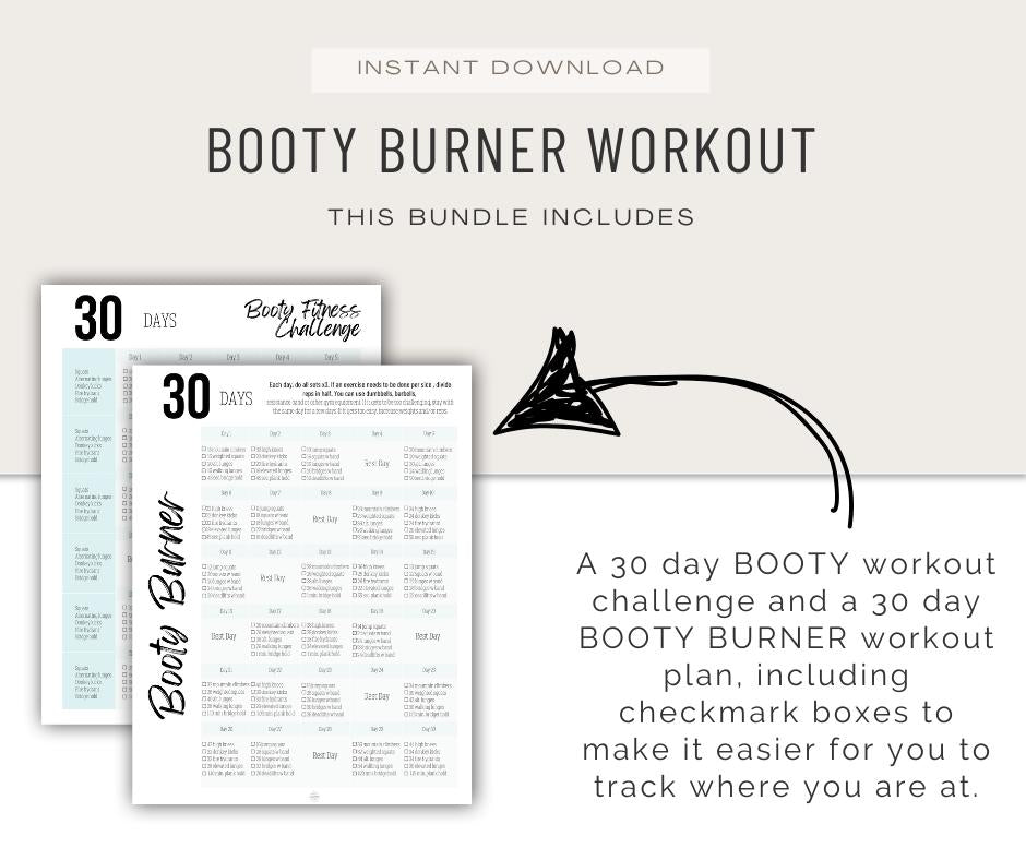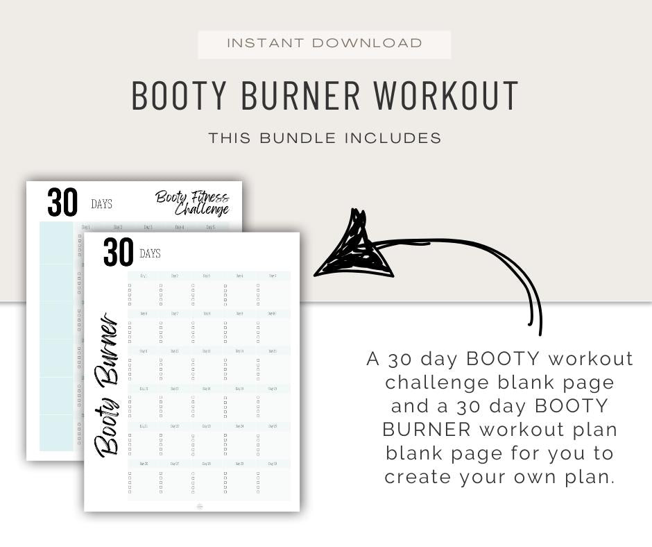- A detailed 30-day booty burner workout plan with increasing difficulty for optimal results.