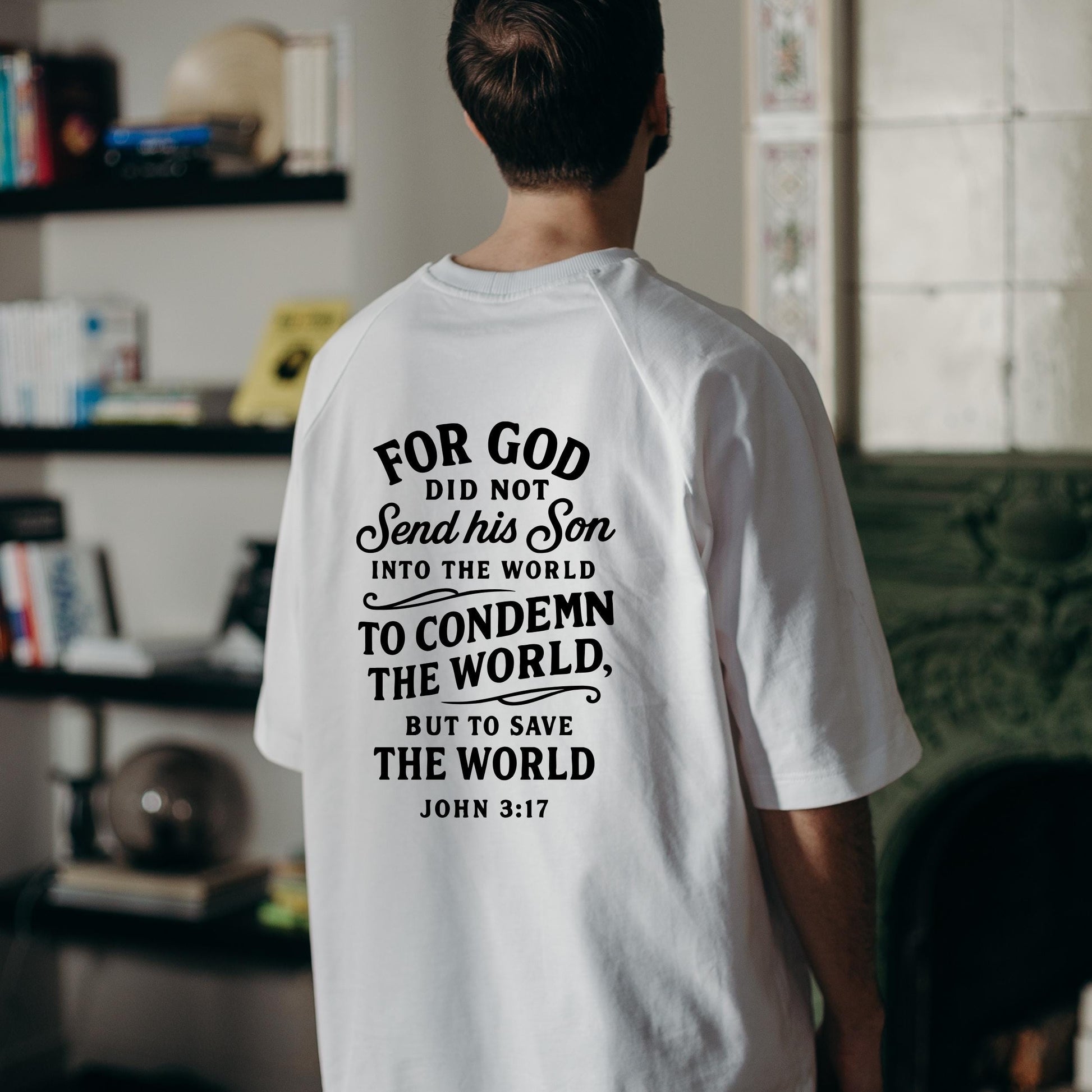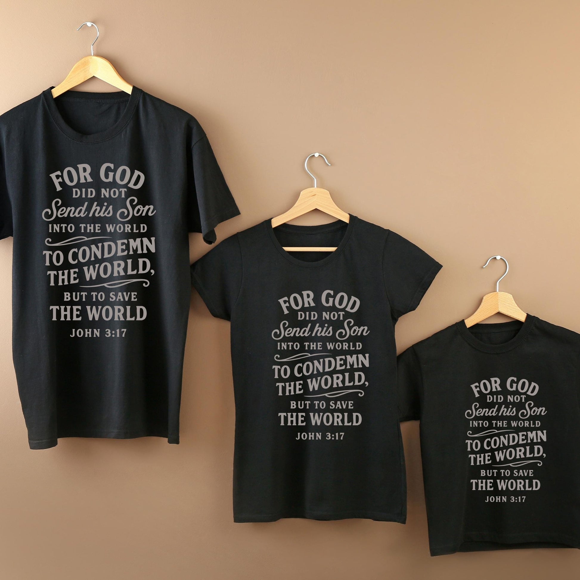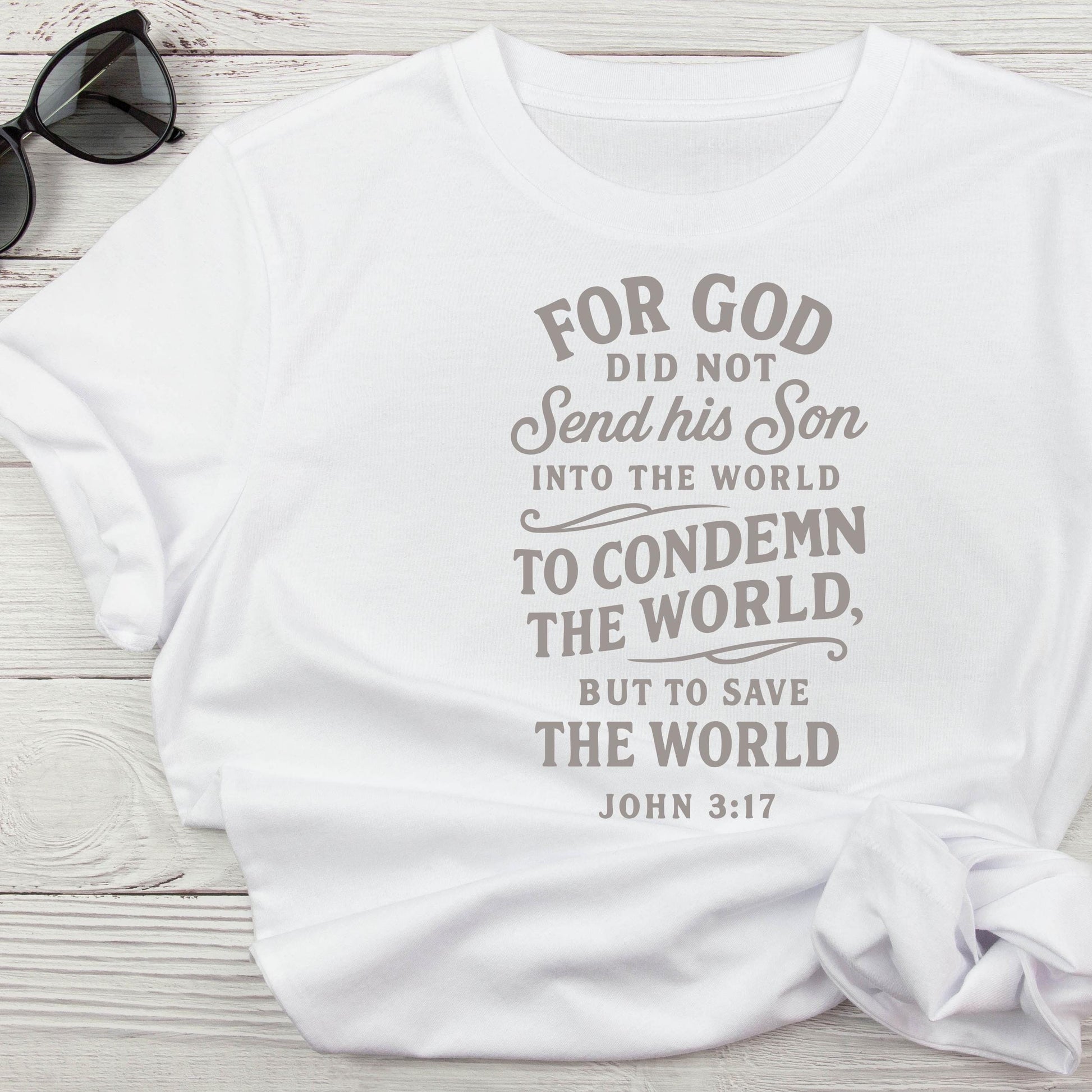 Share the powerful message of John 3:17 with this inspiring heat transfer vinyl design. The verse, "For God did not send his Son into the world to condemn the world, but to save the world through him," is presented in a clean, faith-forward style.