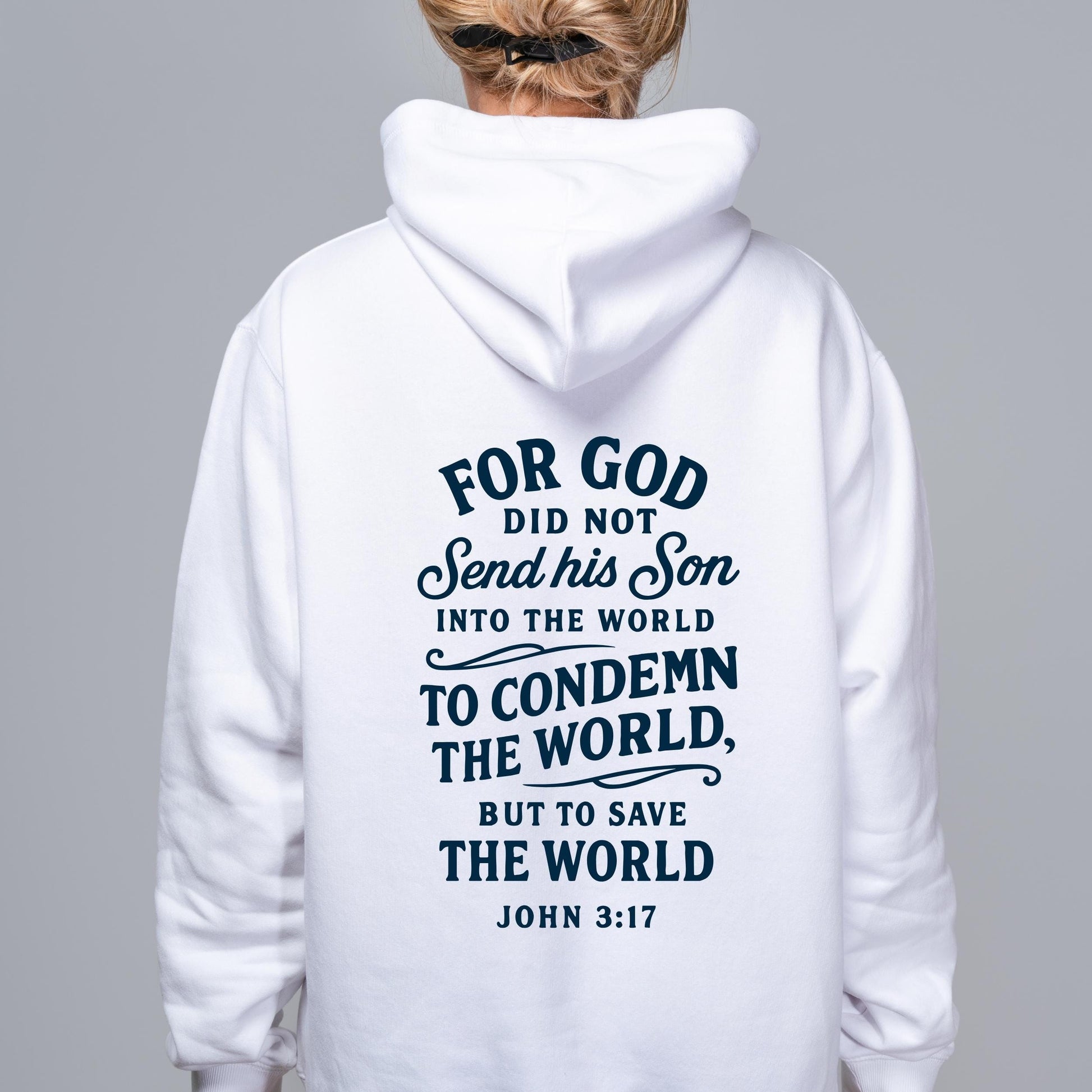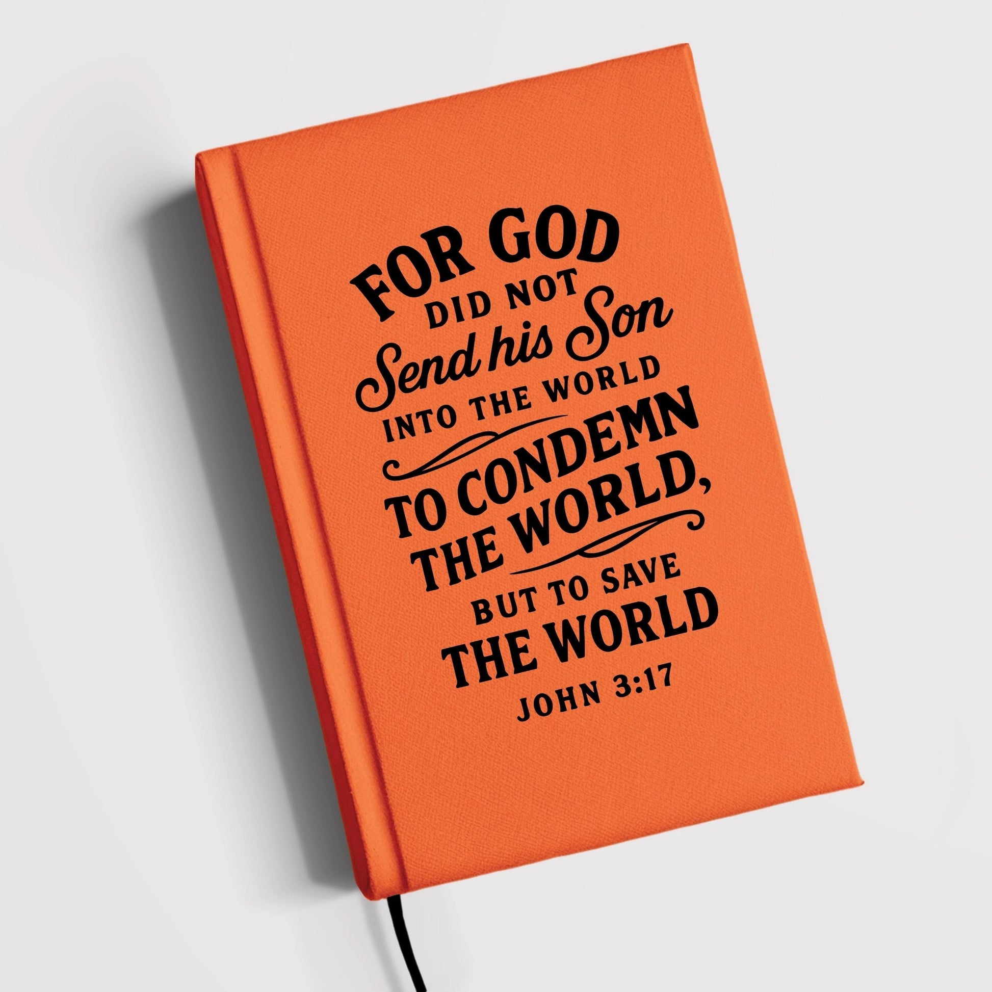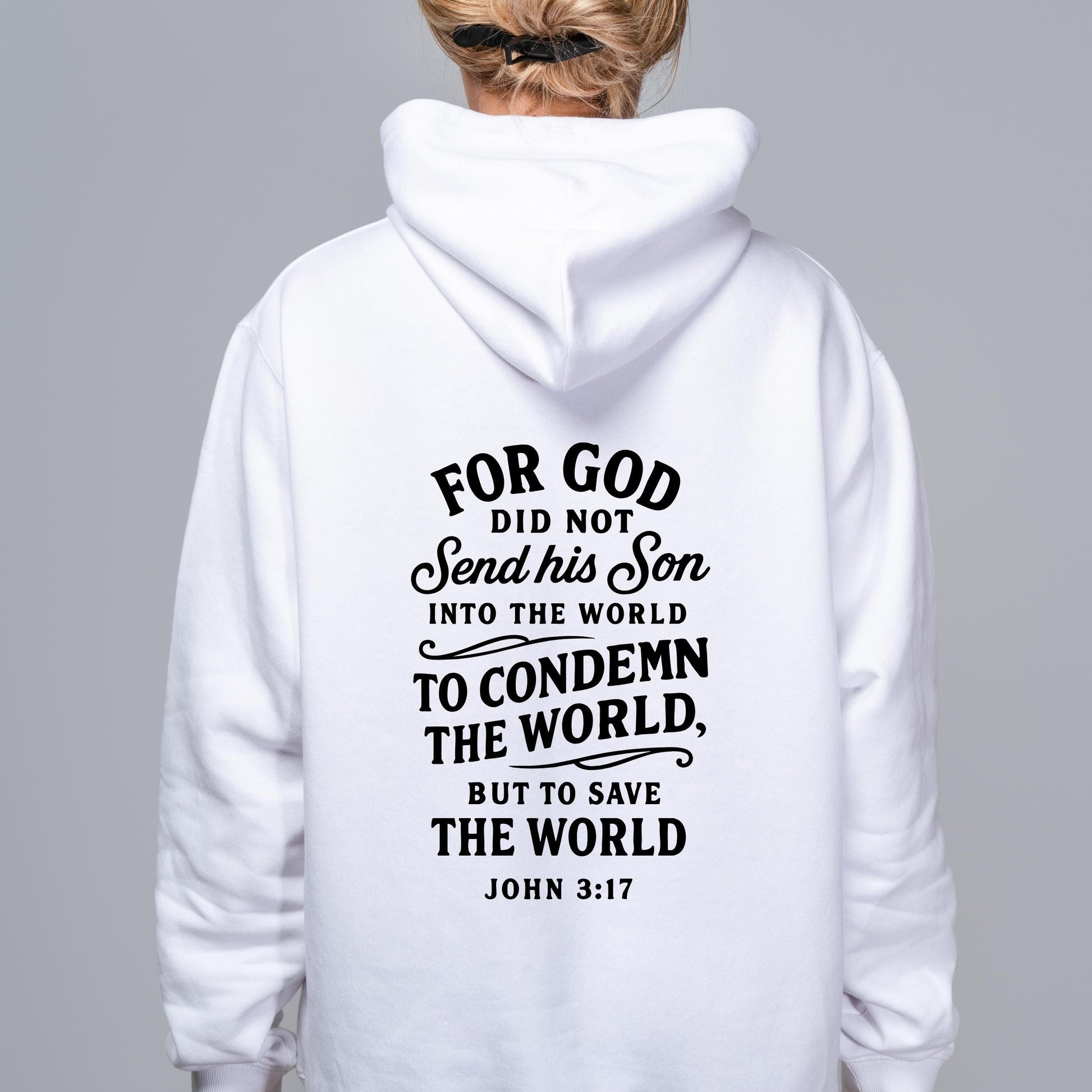 Share the powerful message of John 3:17 with this inspiring heat transfer vinyl design. The verse, "For God did not send his Son into the world to condemn the world, but to save the world through him," is presented in a clean, faith-forward style.
