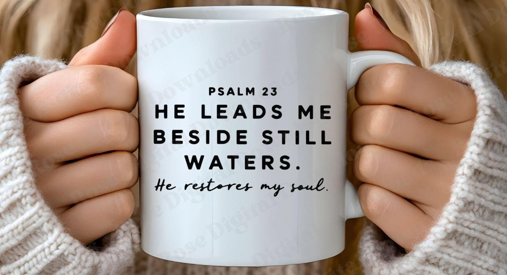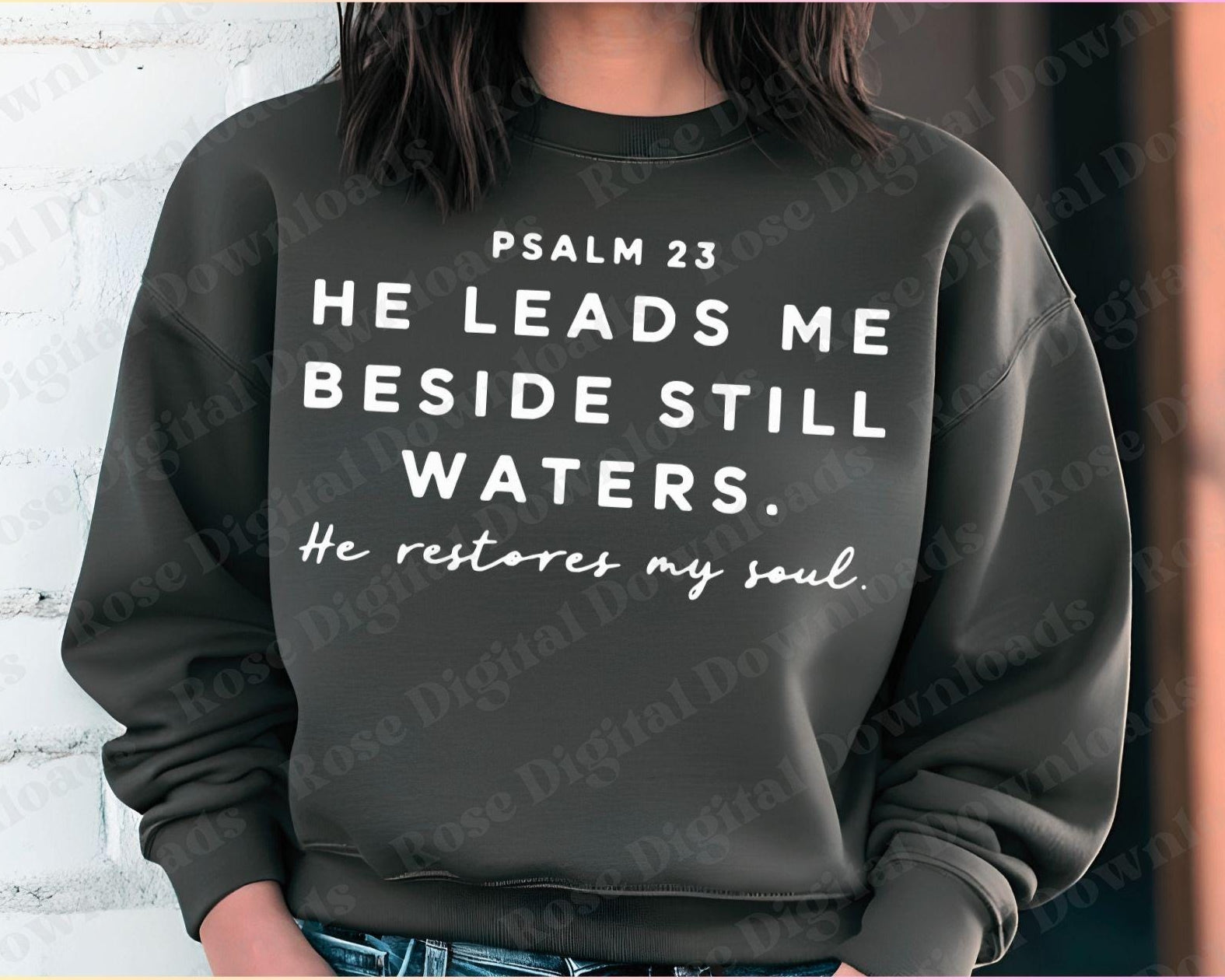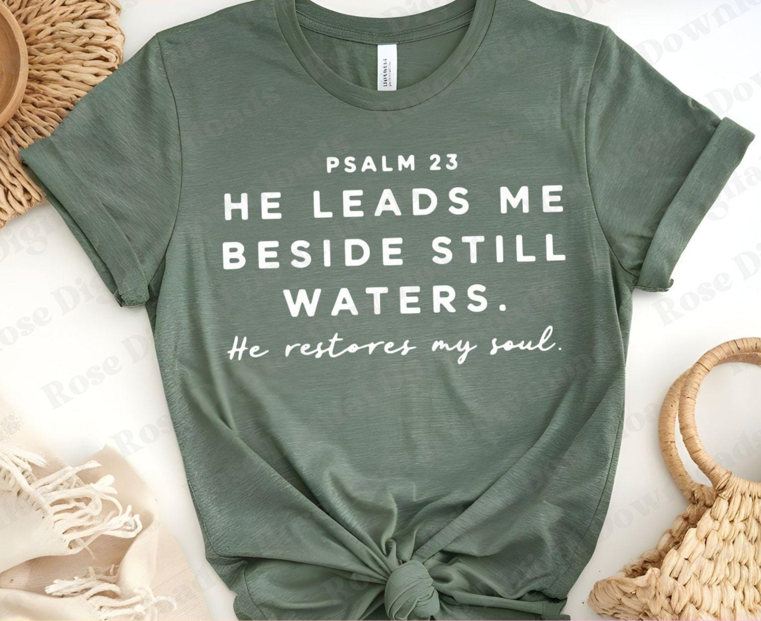 Featuring the iconic words: "PSALM 23 HE LEADS ME BESIDE STILL WATERS. *He restores my soul.*"