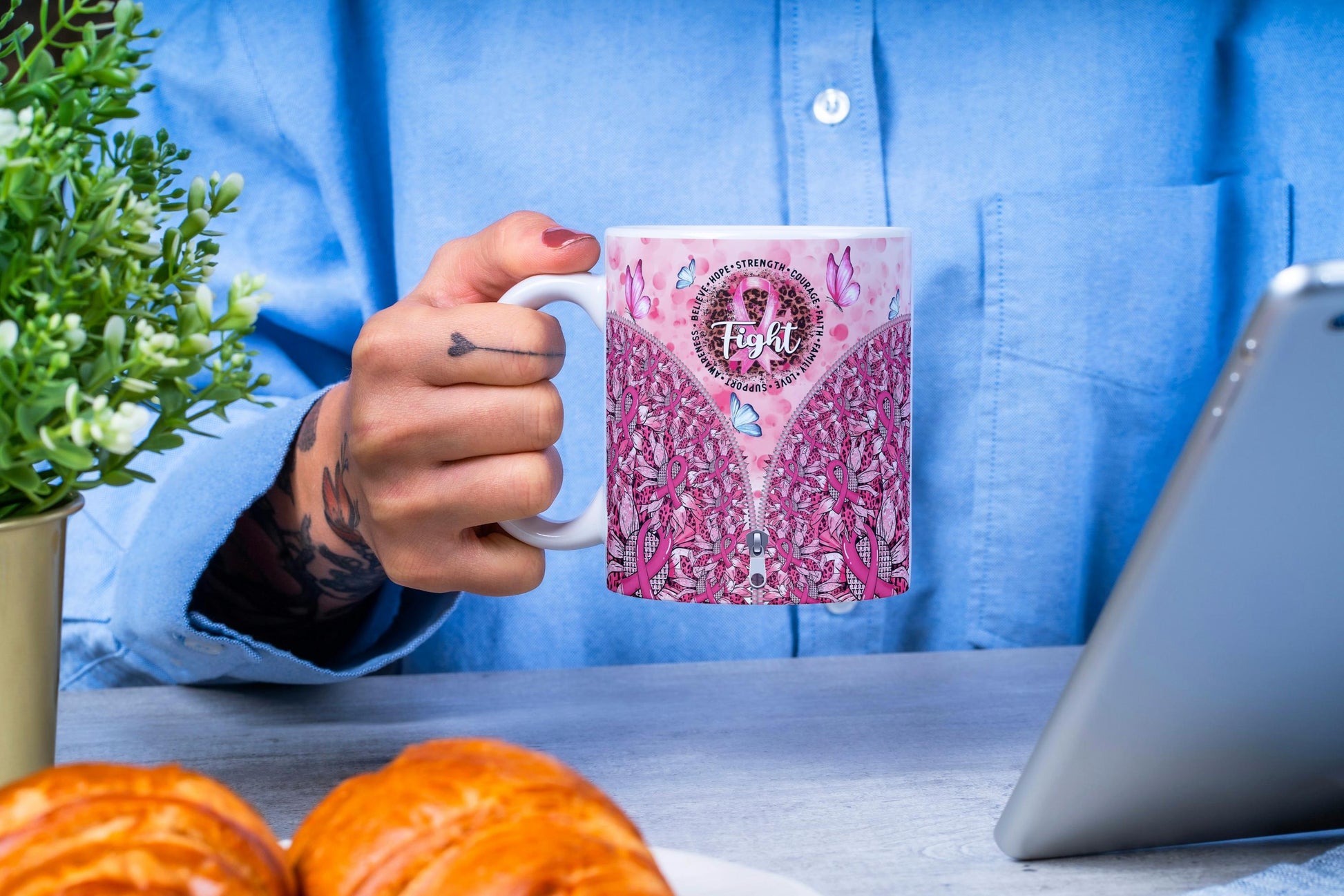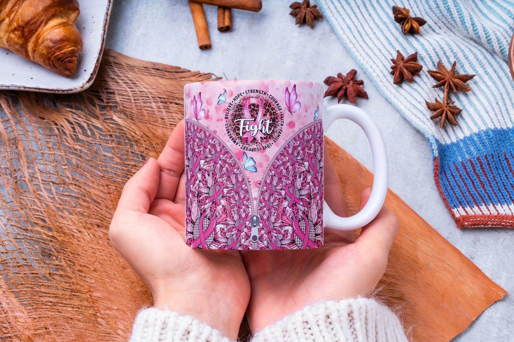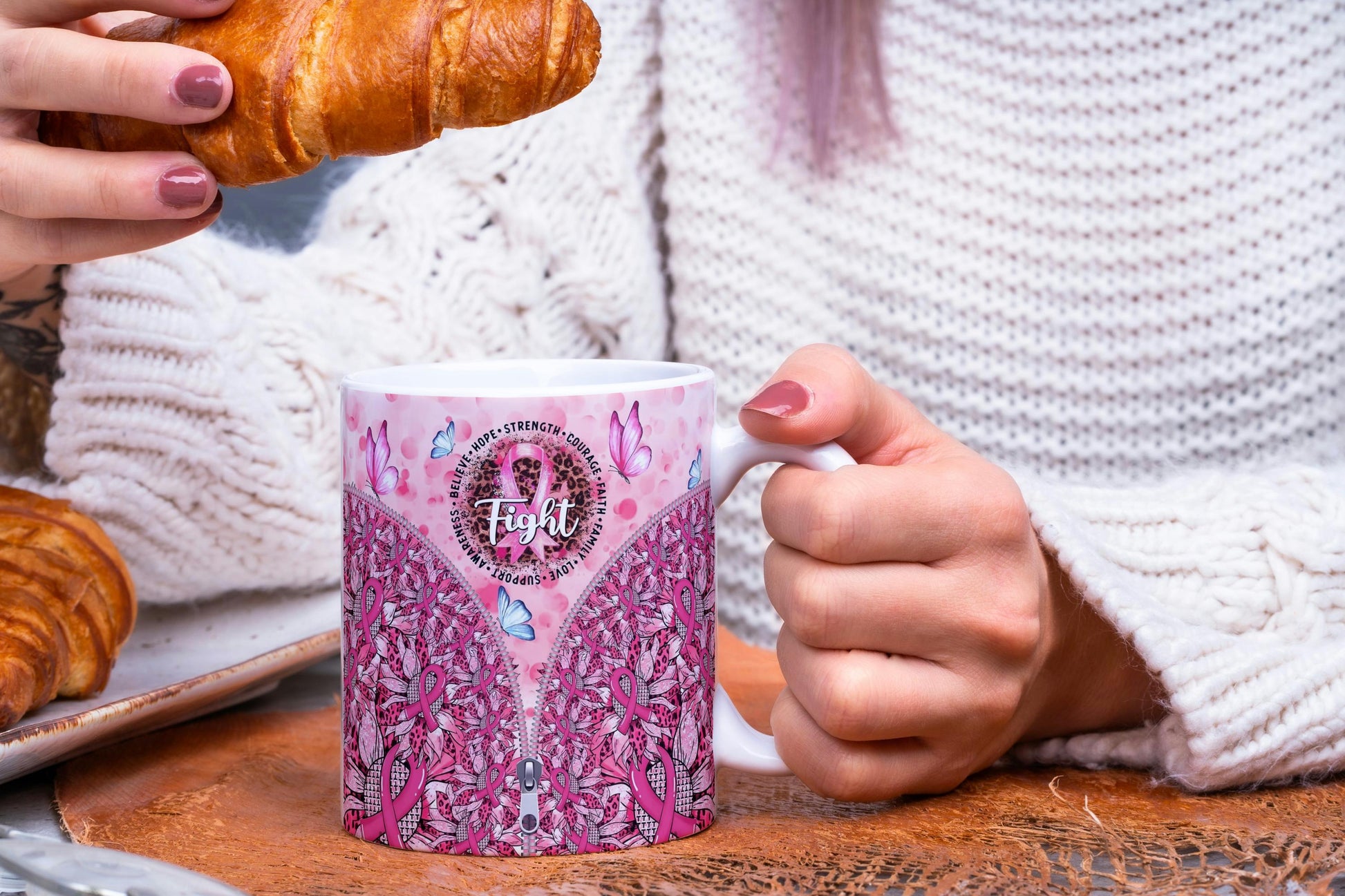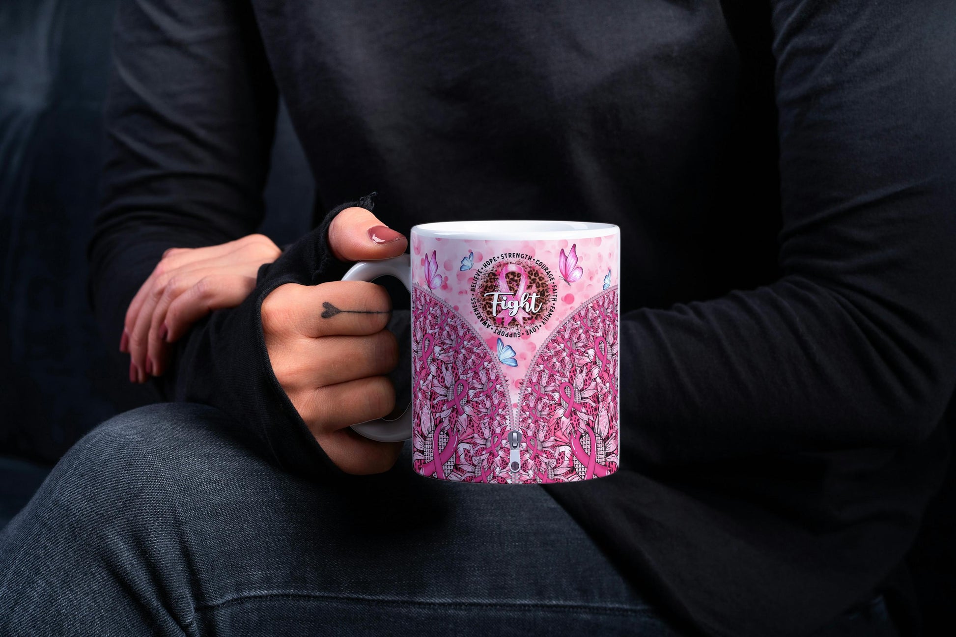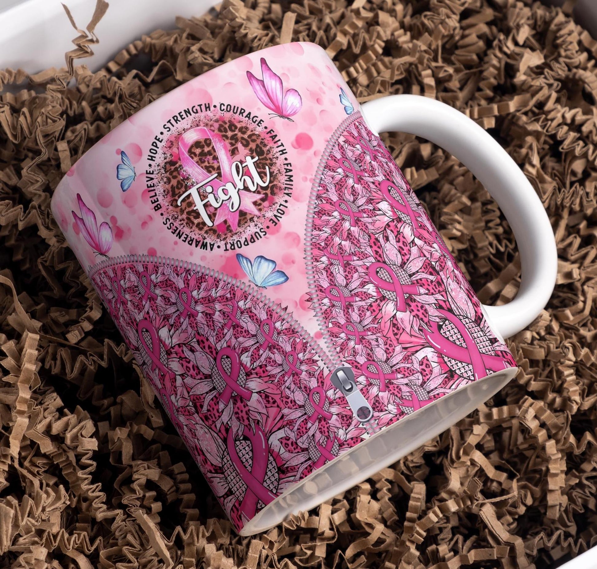 Discover a unique touch with the **stylish zipper design** that adds a modern flair to the mug. Below, a pattern of **sunflowers and flowers** intricately blends pink ribbons and leopard print, adding another layer of visual interest. Delicate **pink and blue butterflies** flutter across the mug, symbolizing transformation and resilience.
