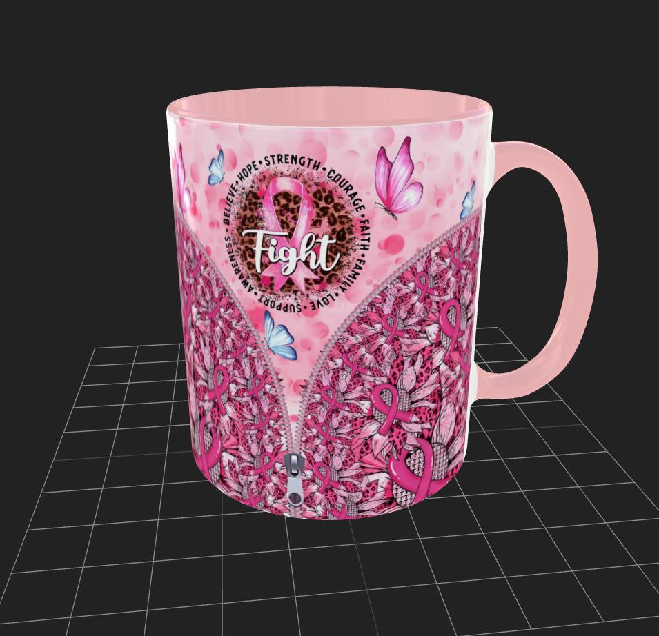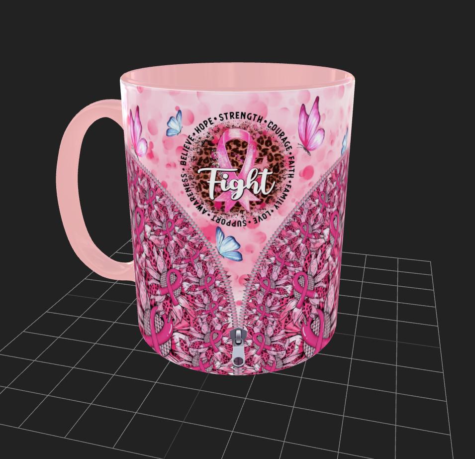 Brighten your mornings with this vibrant mug, featuring a bold pink ribbon – the symbol of breast cancer awareness. The design is adorned with uplifting words like **HOPE, BELIEVE, STRENGTH, COURAGE, FAITH, FAMILY, LOVE, SUPPORT, and AWARENESS**, encircling the ribbon.